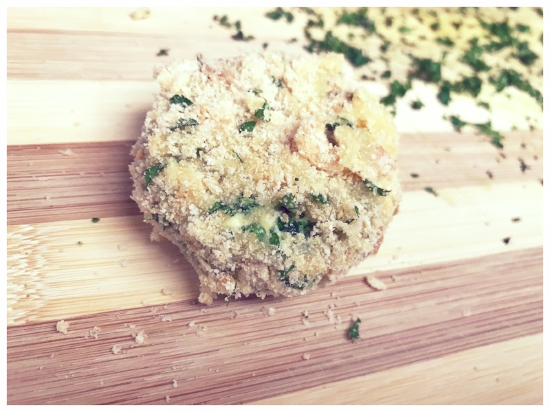 Step 7 - Press the parsley coated goat cheese rounds in to the crushed pork rind mixture.