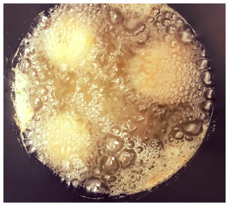 Step 9 - Once oil has reached 350, with a slotted spoon, carefully drop the cheese rounds in to the fryer one at a time, maximum of 3 per batch. Fry for approximately 3 to 5 minutes until golden.