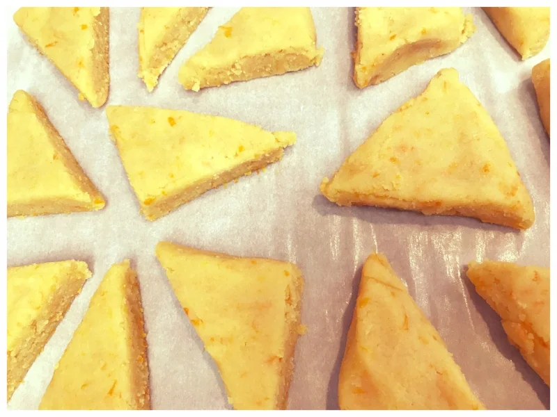 Step 6 - With a long sharp knife, cut in half lengthwise, then in half across the shorter side. Then cut into squares and then cut those squares into triangles.