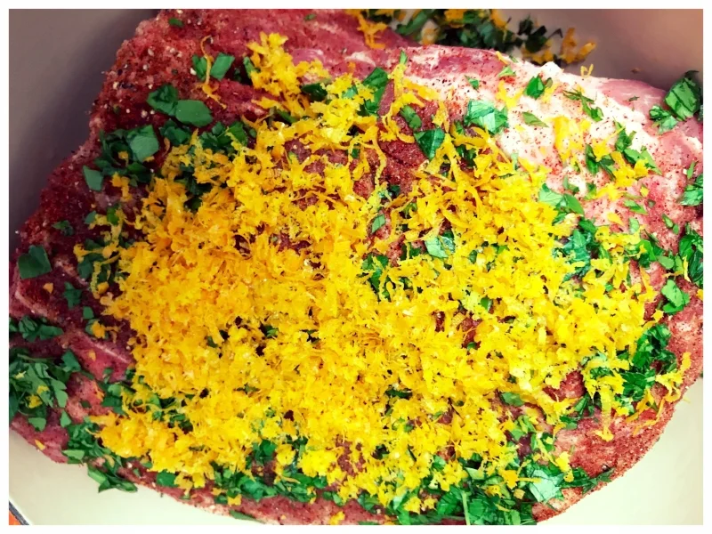 Step 2 - Season pork with all of the spices, herbs, and orange zest.